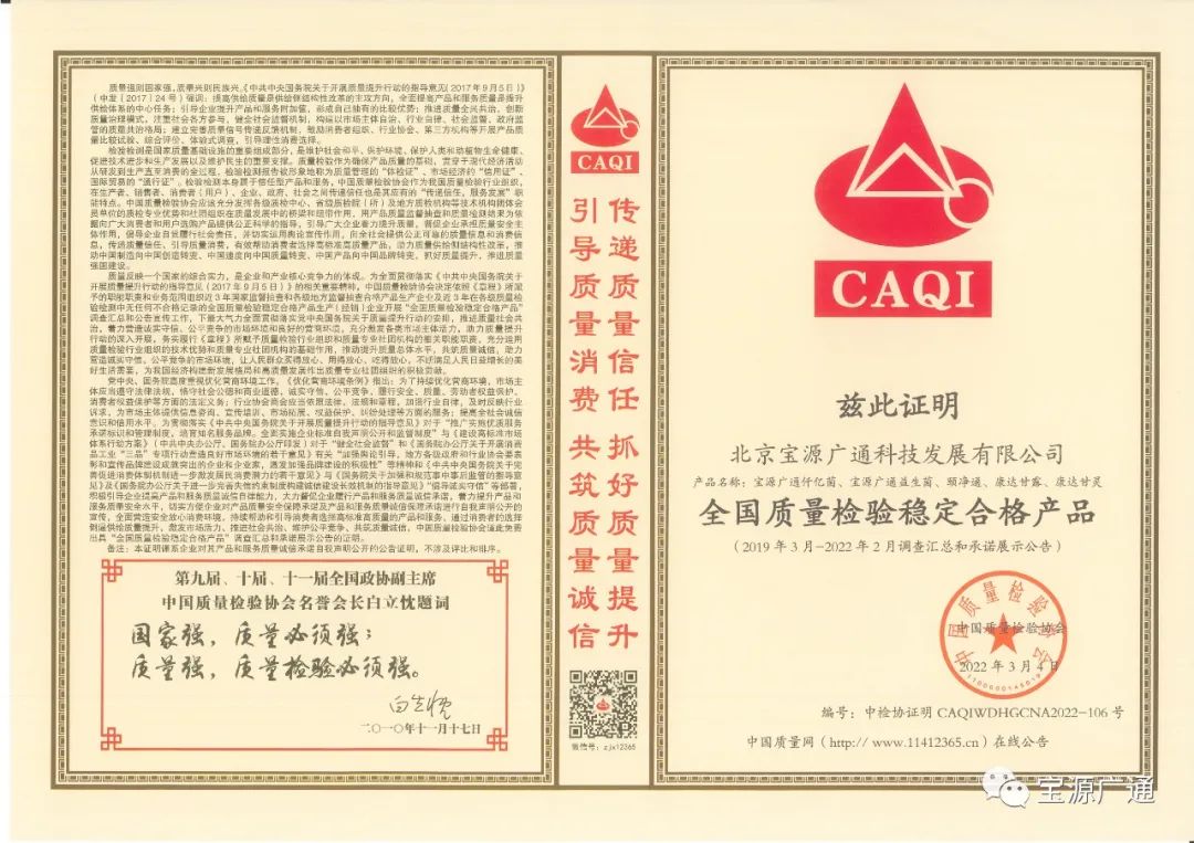 2022年3月4日宝源广通被中国质量检验协会评为全国益生菌行业质量领军企业、全国益生菌行业质量领先品牌、全国消费者质量信誉保障产品、全国质量检验稳定合格产品诸多殊荣
